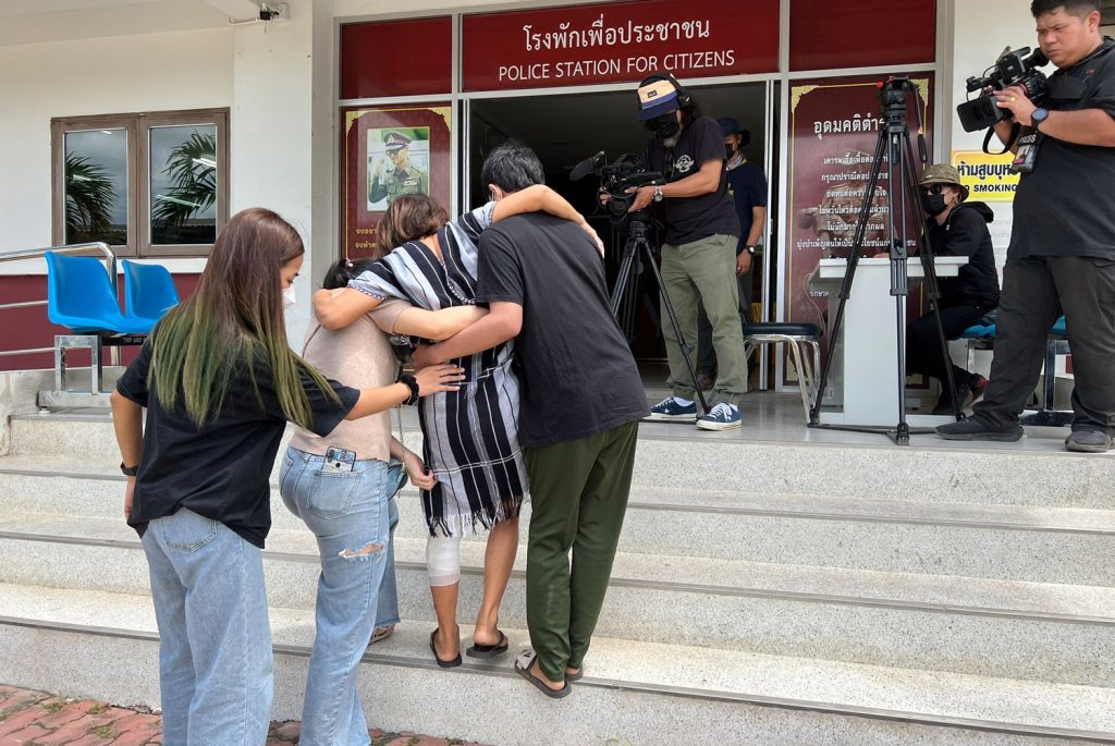 An injured woman, assisted by her family members, arrives at Phlu Ta Luang police station to give a statement. (Photo- Chaiyot Pupattanapong)