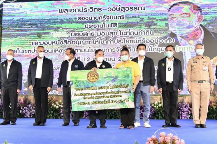 Gen. Prawit handed over land use permits to the locals, who will now be able to live or make their living on forest reserve land. Identification documents for persons permitted to make their living in community areas were also handed over. The said documents were presented to 1,231 locals who resided in Chong Khaep and Mae Koen Kaen forests. The acting prime minister also spoke to locals about the government’s policy on giving people rights to work the land. He asked the rights receivers to utilize land to their utmost capability, saying this would contribute to sustainable national development.