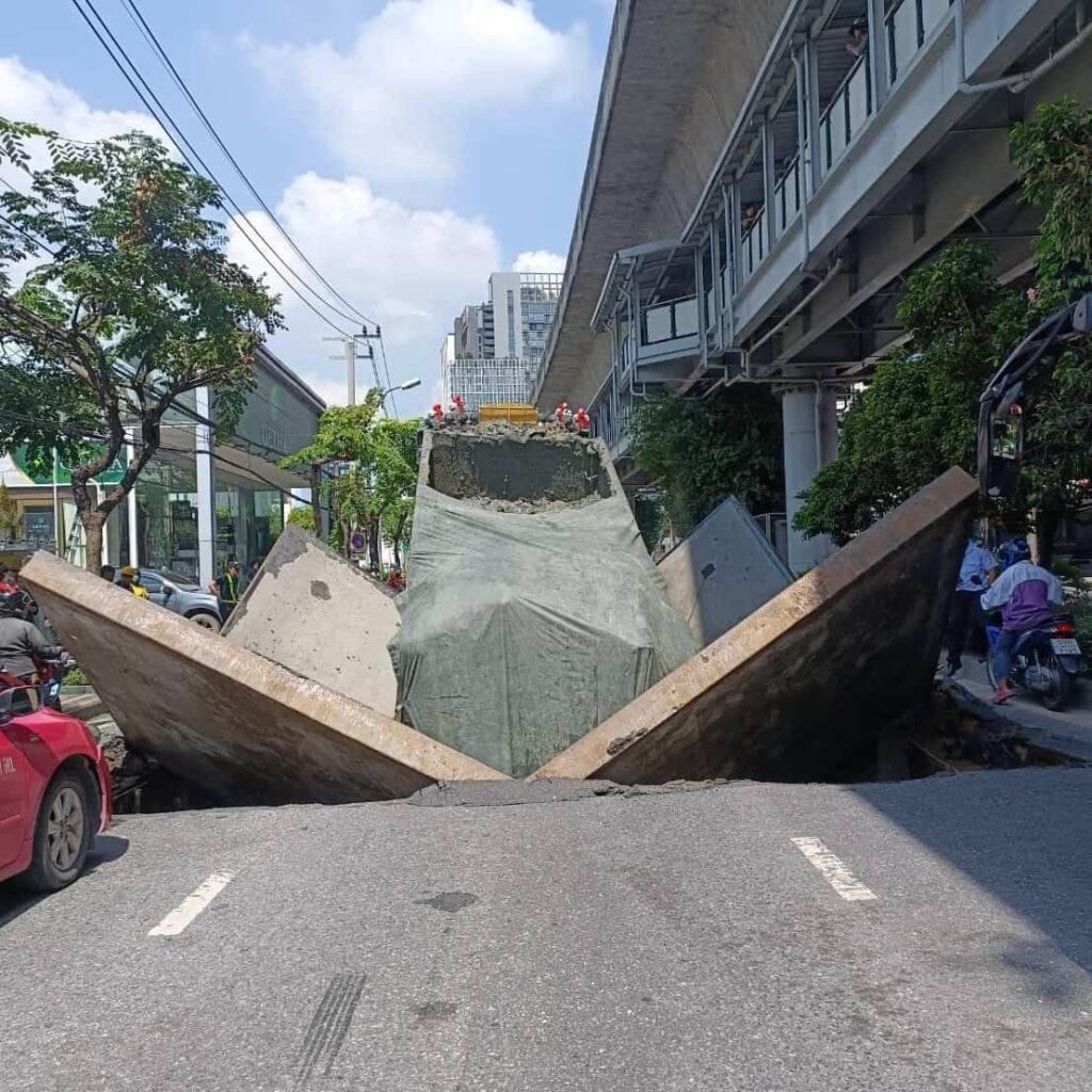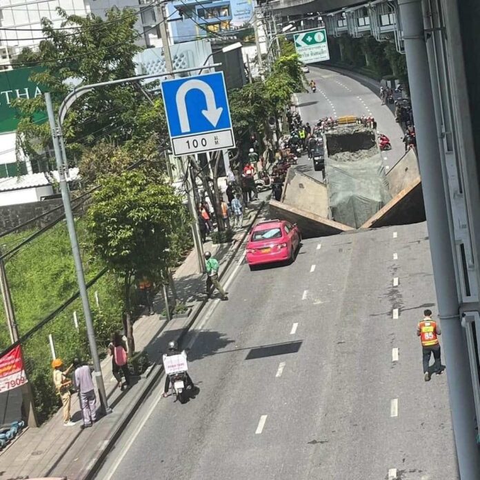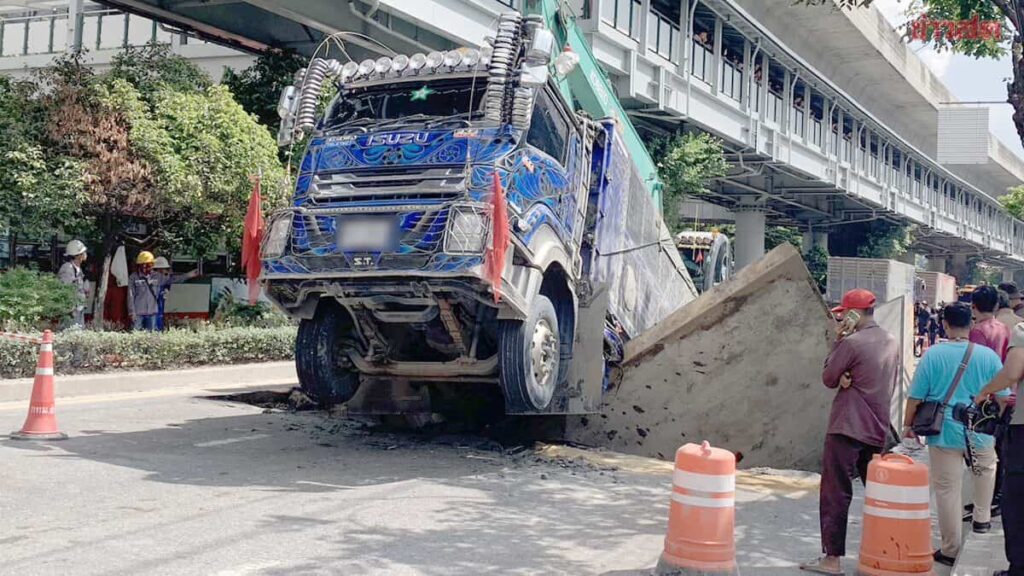 Mr. Sakmongkol Tasago, a 29-year-old truck driver involved in the incident, shared his experience. He had been transporting soil from a condominium construction site to a nearby location when the incident occurred. He noticed that the concrete slab supporting the rear wheel of his truck had collapsed, causing the front of the vehicle to tilt upwards. Mr. Tasago quickly exited the truck and observed that a taxi following behind had also sustained damage.
