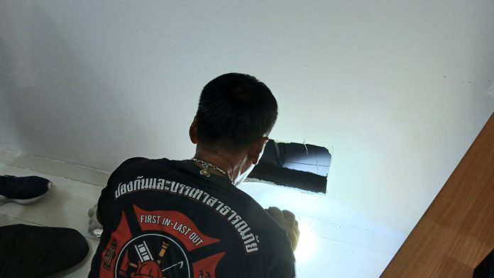 At around 11 a.m. on October 10, 2567, Praphat Charoensantisuk, Deputy Mayor of Si Racha, received a report from locals about a cat stuck behind the ceiling of a shop near Sam Chai Junction in the town’s municipal area. Firefighters were dispatched to the scene and quickly worked to cut through the ceiling panels and reach the cat, which had been meowing for help.